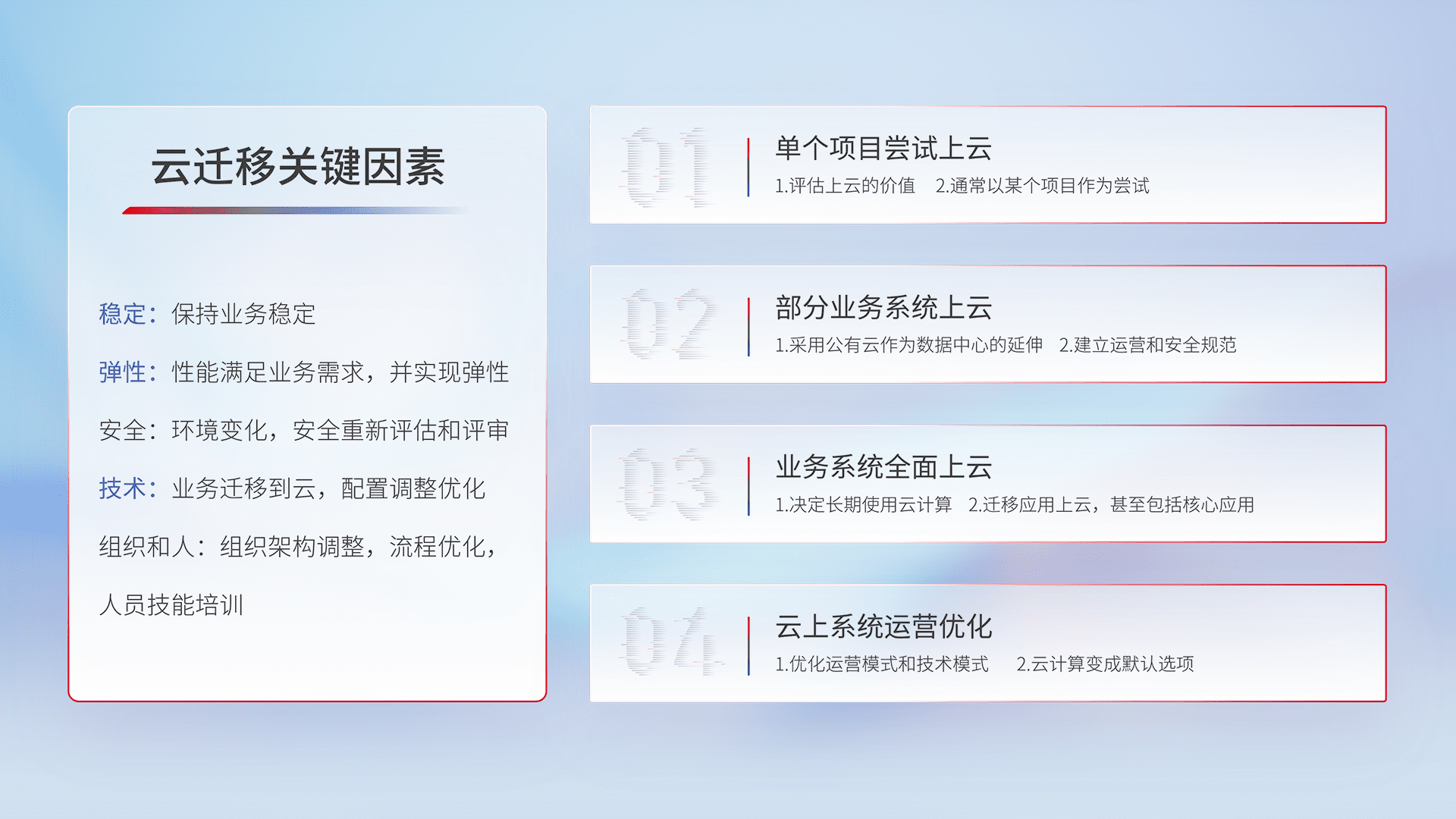 结合实际业务,,,,从规划设计、、云平台选型、、、云原生改造、、、、数据迁移、、、集成交付,,,迁移全过程为客户识别最佳上云路径,,,做好风险识别管理,,,,设计网络架构、、、、身份权限、、安全审计合规、、、、操作审计、、、日志审计、、监控告警策略、、、、多站点容灾设计等,,,,对云上基础设施进行整体规划,,提升IT治理水平,,,以满足弹性、、高可用、、高性能的需求。。