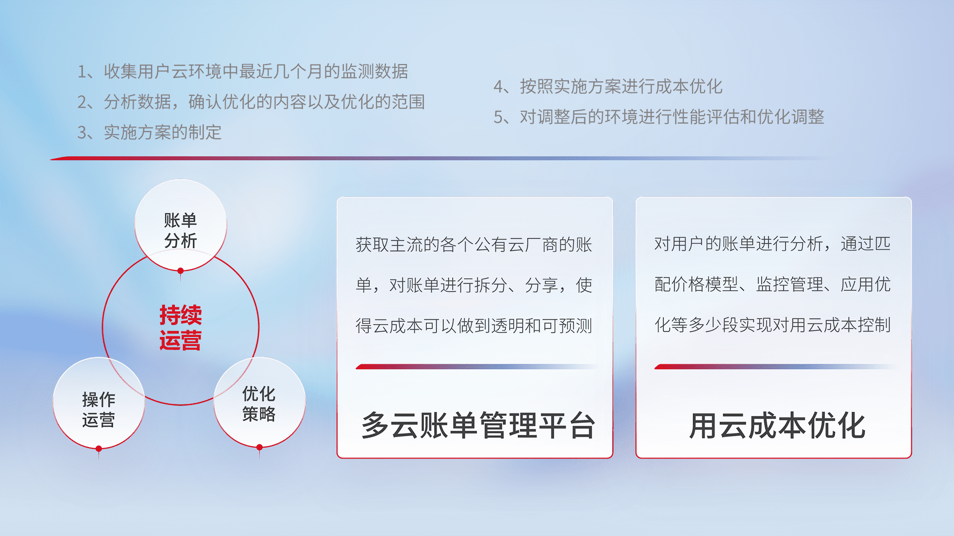 通过多云纳管,,,,以统一的资源数据模型把客户的云资源进行抽象和封装,,,,进而实现对多云资源的统一操作,,保障云资源管理的可靠性、、稳定性与可用性。。。量身定制化运维内容,,配置、、、、开发运维、、、补丁管理、、、、备份、、监控、、、、认证和访问管理、、、审计和日常巡检等,,,保障在用云过程中的可靠度,,,稳定度以及高可用率。。。。